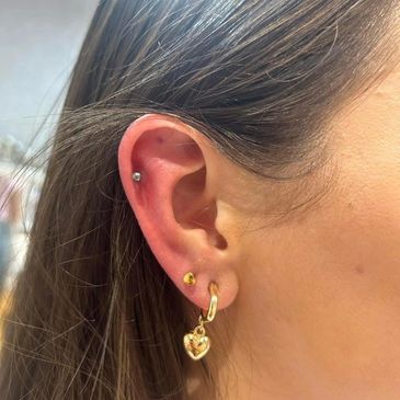 All single ear piercings including helix, daith, tragus, rook etc. also septum, lip, nipple, naval & eyebrow. Includes titanium Jewellry